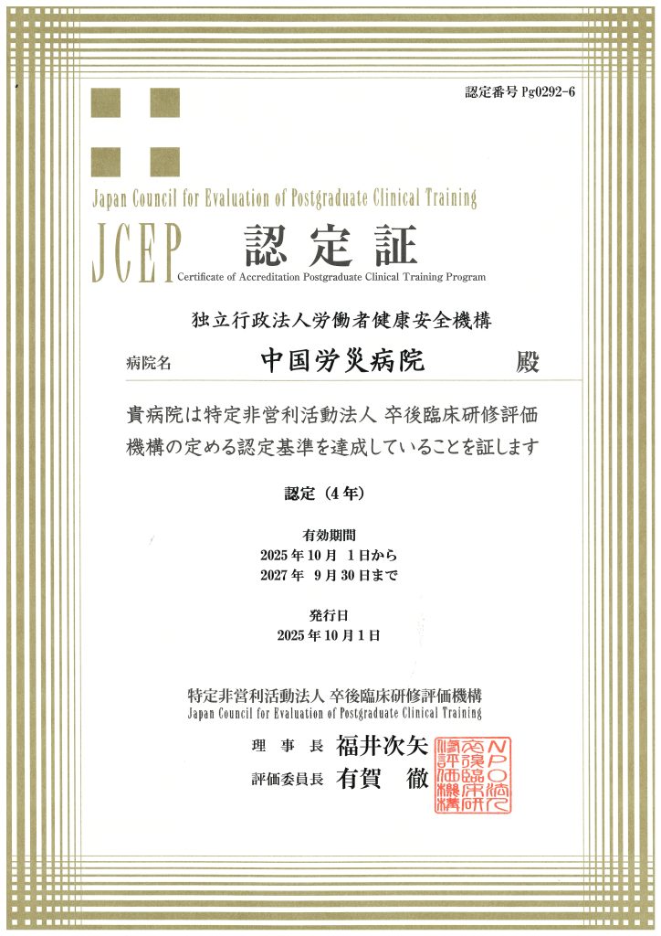 中国労災病院は、臨床研修分野の質の改善を図るためにNPO法人 卒後臨床研修評価機構(通称:JCEP)が行う臨床研修評価を受審し、2021年10月1日に認定を受けました。